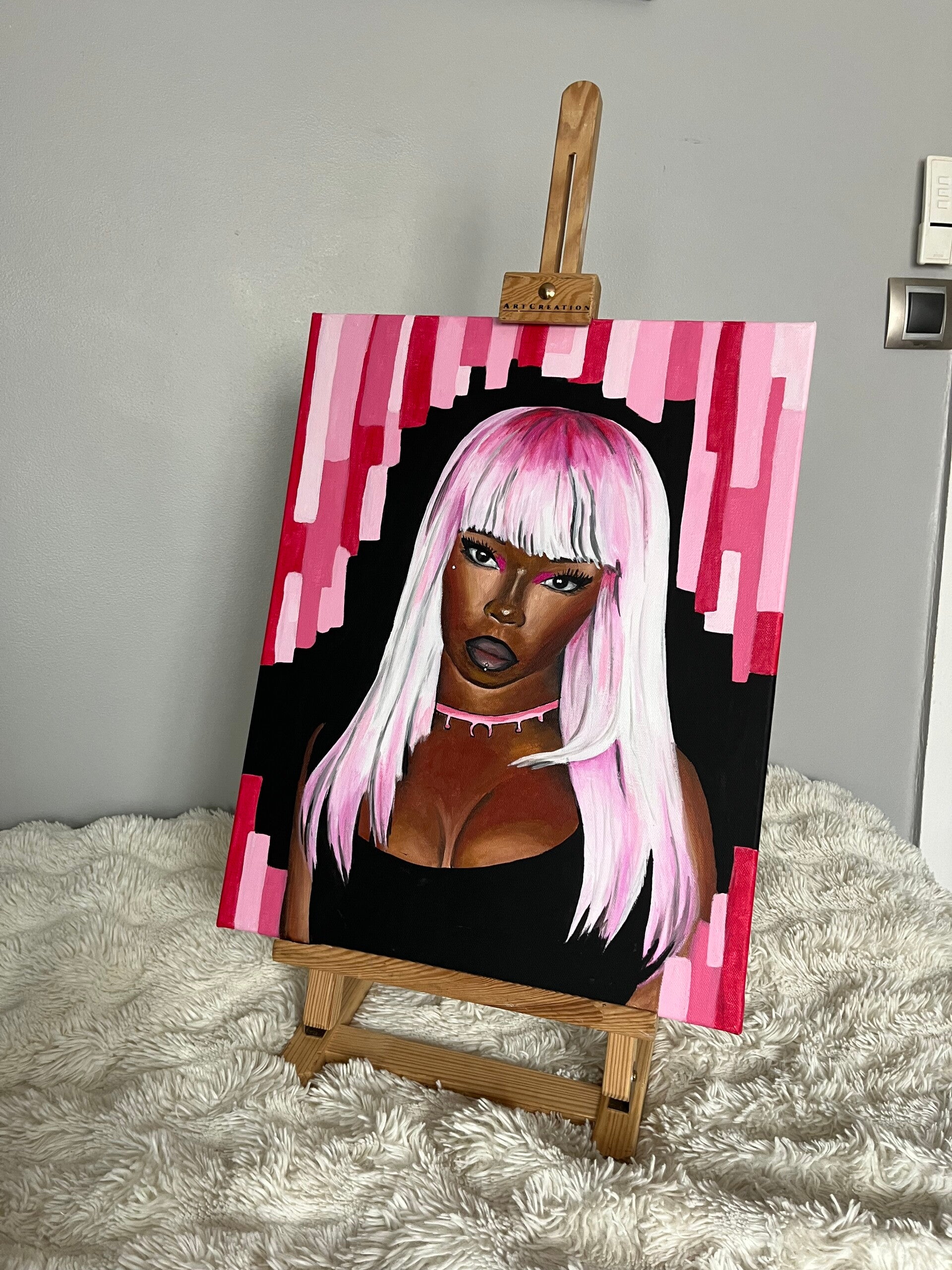 Ce tableau au format 40×50 cm est un portrait de Théodora réalisé à la main à l’acrylique, dans des tons rosés. Cette pièce est unique, il n’existe qu’un seul exemplaire disponible.