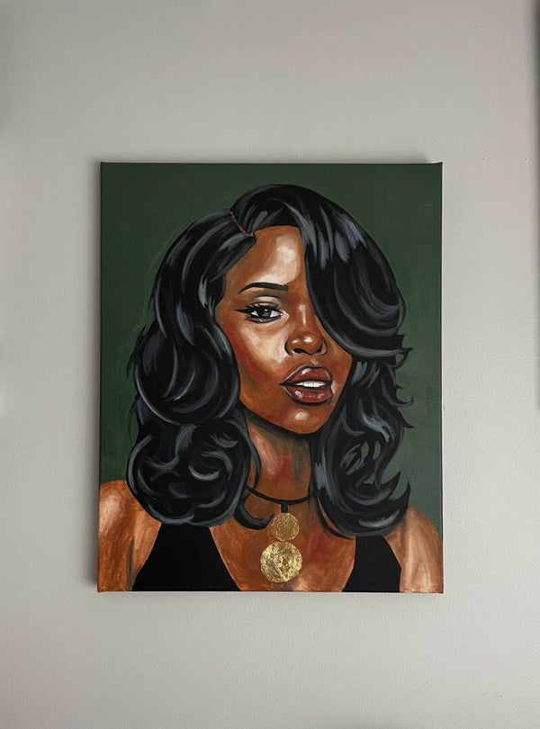 Ce tableau au format 40×50 cm est un portrait féminin réalisé à la main à l’acrylique, avec une touche d'or sur le collier. Cette pièce est unique, il n’existe qu’un seul exemplaire disponible.
